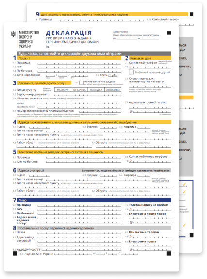 Документи, які знадобляться для підписання угоди з лікарем, – ваш паспорт та ідентифікаційний номер. Якщо ж ви підписуєте декларацію з педіатром (чи сімейним лікарем, який буде обслуговувати вашу дитину), то також знадобиться свідоцтво про народження дитини та документи (паспорт та код) одного з її батьків або опікунів.